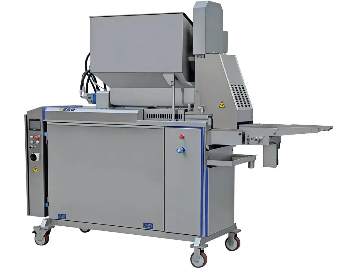 Máquina de ModeladoLa máquina de modelado automática completa el relleno y modelado de la carne. Puede ser integrada junto a la máquina de rebozado, la máquina de cobertura de harina, la freidora, la máquina de cocción a vapor, la congeladora, y la máquina de empaquetado para formar una línea de producción completa y automatizada. Es adecuada para el modelado de carne, pescado, papas, o vegetales, así como para variedad de productos troceados, carnes de hamburguesa, nuggets de pollo, palitos de pollo, y filetes de pescado.
