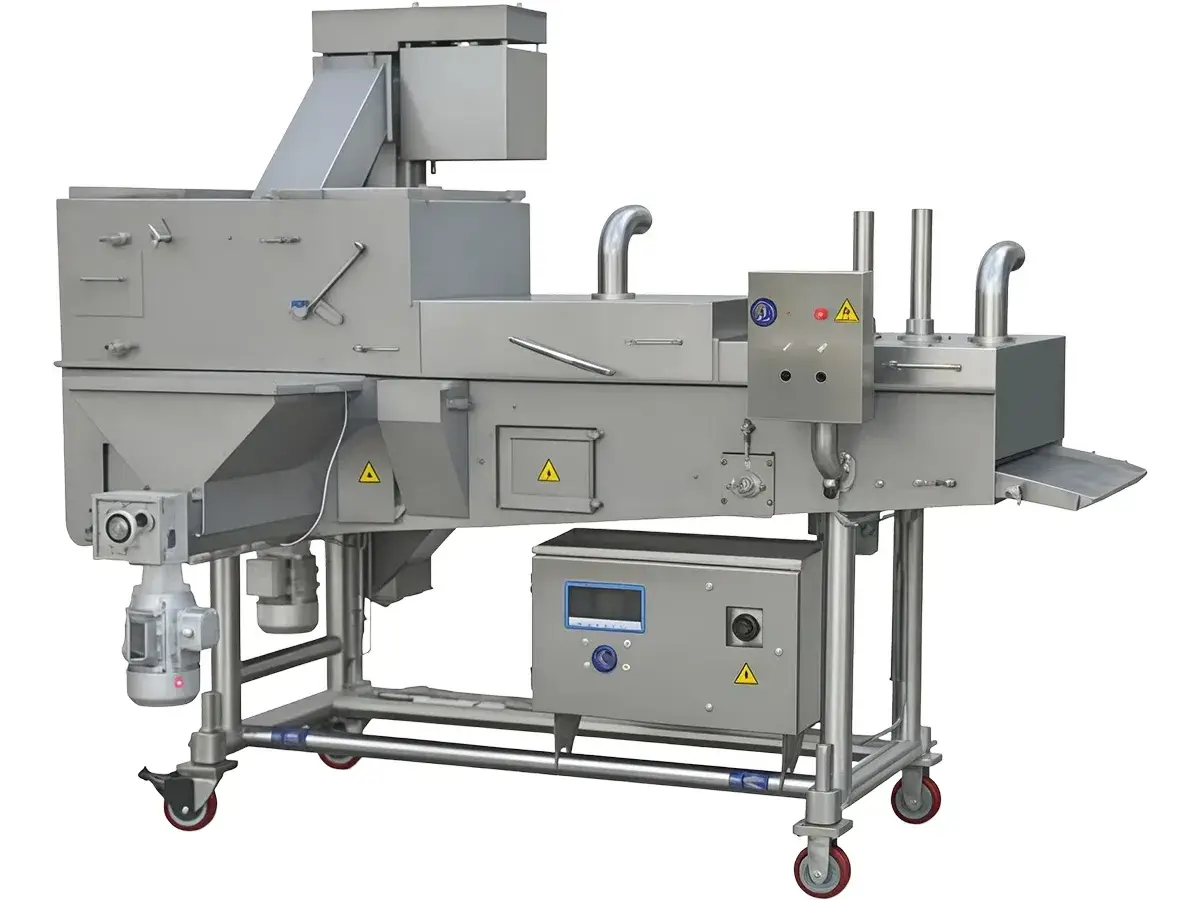 Máquina de RebozadoLa máquina de rebozado garantiza que el pollo, carnes, cerdo, pescados, camarones, entre otros productos, queden completamente sumergidos y recubiertos. Mientras el producto se mueve sobre la banda transportadora, pasan a través de un sistema de recubrimiento en cascada de mezcla cubriendo superficie y laterales, mientras que es simultáneamente sumergido y desplazado sobre otra capa de mezcla en el inferior asegurando cobertura completa.