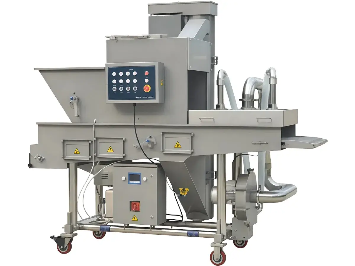 Máquina de Cobertura de HarinaMientras que los productos se desplazan a lo largo de la banda trasportadora, un recubrimiento inferior en la cinta y un sistema de recubrimiento en cascada cayendo desde arriba cubren homogéneamente el producto con una capa de encolante o harina mezclada, dejando el producto listo para posteriores procesos. Este equipo puede ser conectado a las máquinas de empanizado y rebozado para formar una línea de producción para variedad de productos.